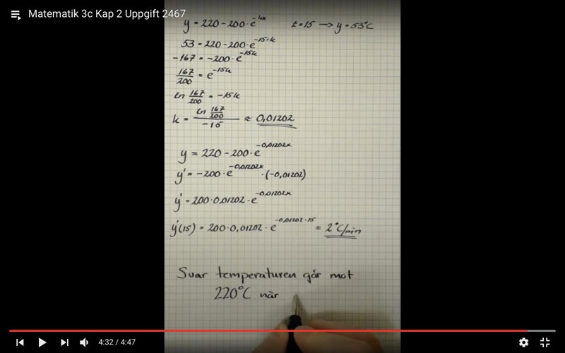 3467 a) Det står klart och tydligt att x är minuter och i a uppgiften ska man väl ersätta x med 15? Men dom skriver istället y=220-200*e^-15*k varför blir x negativt när k var negativt från början?