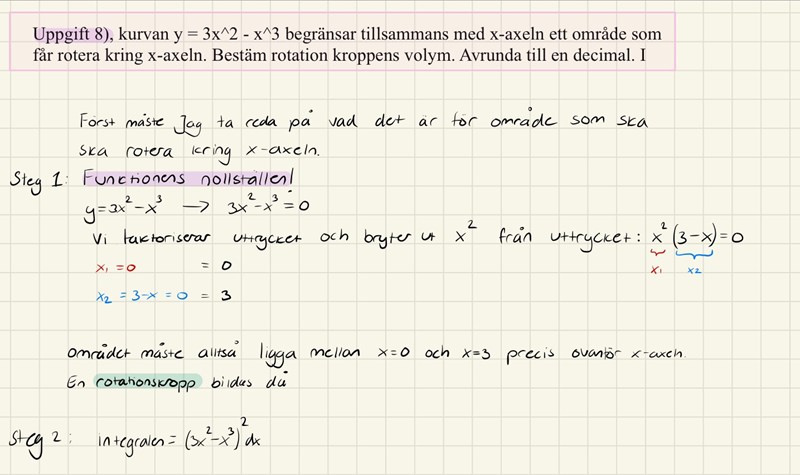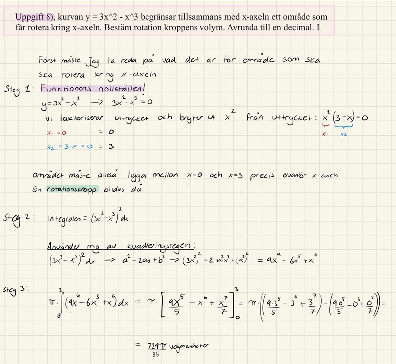y = 3x^2 - x^3 begränsar tillsammans med x-axeln ett område som får rotera kring x-axeln.