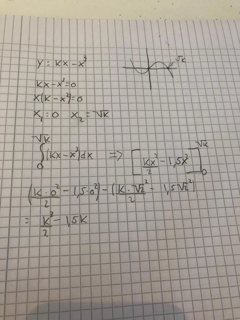 "Kurvan y= kx-x^3 avgränsar tillsammans med x-axeln ett område i den första kvadranten om k är en positiv konstant. Bestäm områdets area uttryckt i k.