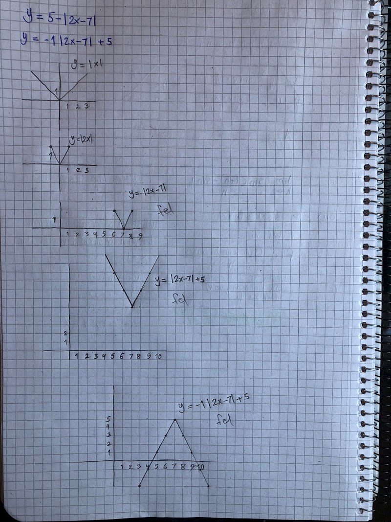 Här är en graf: y = 5 är röd, y = |2x-7| är blå och y = 5-|2-7x| är grön.