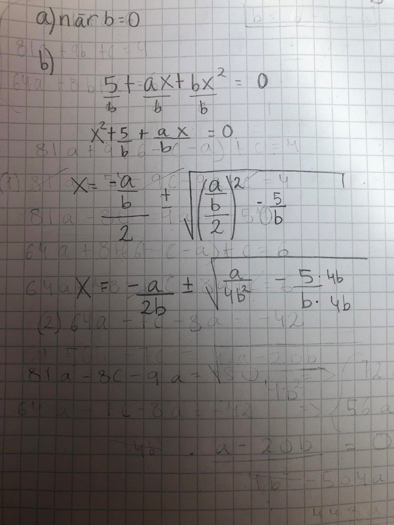 A) Det som kännetecknar en rätlinje är dess y=kx+m form. Det betyder att bx inte bör finnas i en andragradsekvation. Alltså för att det ska vara en rätlinje bör b=0 .