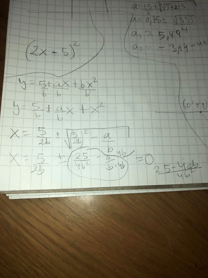jag jobbar alltså med diskriminaten. Jag måste hitta b värdet som ger oss 0 under rottecknet. Detta b värde enligt mina uträkning är 0. För 25/4*0=0 men det verkar fel. Hur tänker ni?