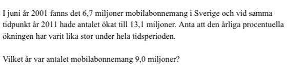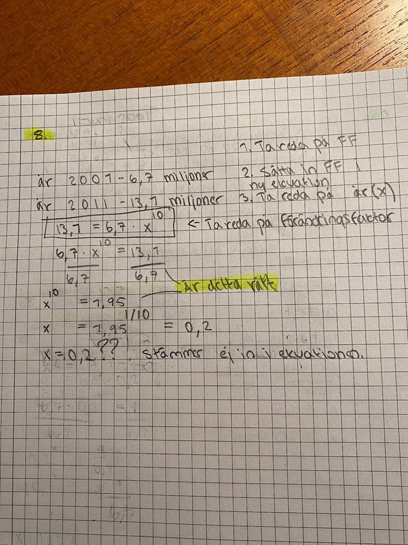 jag har börjat min uträkning genom att försöka ta reda på förändringsfaktorn. Men när jag försöker få fram X så passar det inte in i ekvationen. Jag gör detta för att sedan kunna använda min förändringsfaktor för att räkna ut vilket år.