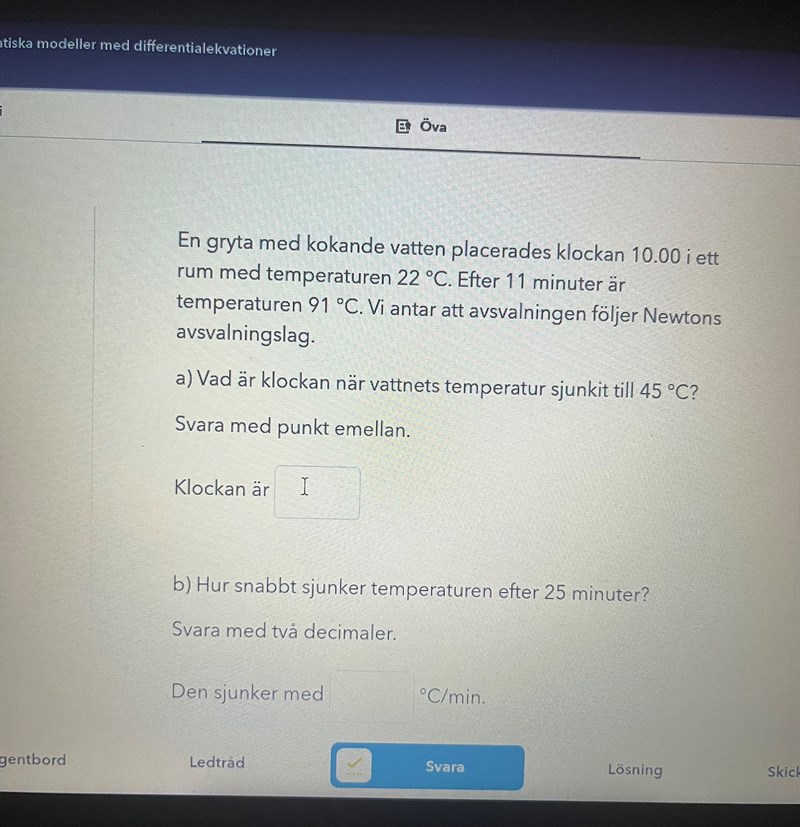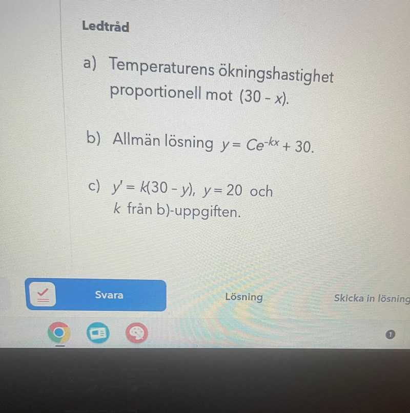 Hej jag löser några problemlösnings differentialekvationer och ser att man antar olika saker i formeln y’=-k(a-y). I en uppgift har man lagt ett x-värde medan i en annan så har man lagt in x-värdet i funktionen y och sedan lagt in värdet i formeln y’=-k(a-y). Kan någon förklara om detta är möjligt och isåfall varför då jag inte ser sambandet mellan de. Jag bifogar två bilder på de olika lösningarna så att man enklare förstår!