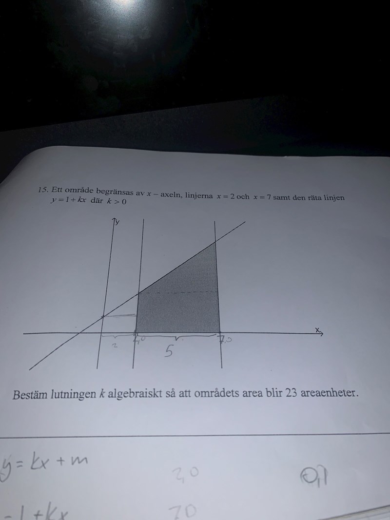 Analys skrev:Precis, dela upp i rektangel och triangel. Uttryck båda som ett uttryck i k, lägg ihop dem och sätt lika med 23.