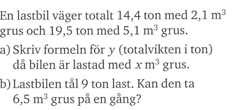 (a) du har vikten y(x) när bilen är lastad med x kubikmeter grus
