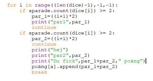 problemet är att den helt enkelt inte varken printar ut hej eller printar ut ("Du fick...poäng") eller lägger till poäng summan i listan poäng, flyttar jag ut desa rader ur loopen så kommer det upp att par_1 och par_2 inte är definerade. Behöver tips på vad som är fel :/