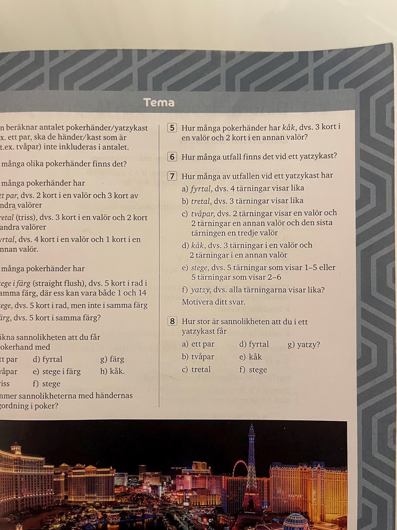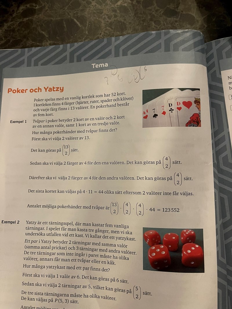 För uppgift d) kan vi resonera på liknande sätt: En kåk består av en triss och ett par. Välj ett värde till trissen på 6 sätt, välj ett annat värde till paret på 5 sätt. Det finns alltså olika kåkar man kan få.