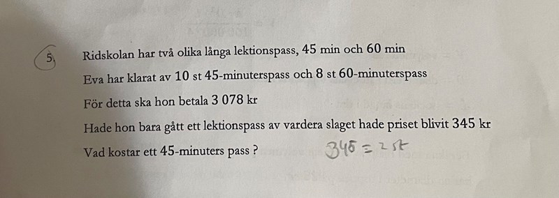 1. Vi vet att ett långt plus ett kort pass kostar 345 kr. Hur mycket kostar 8 korta och 8 långa pass?