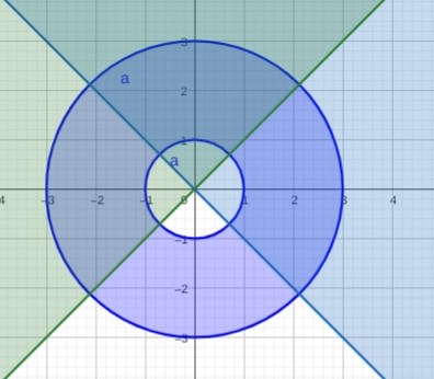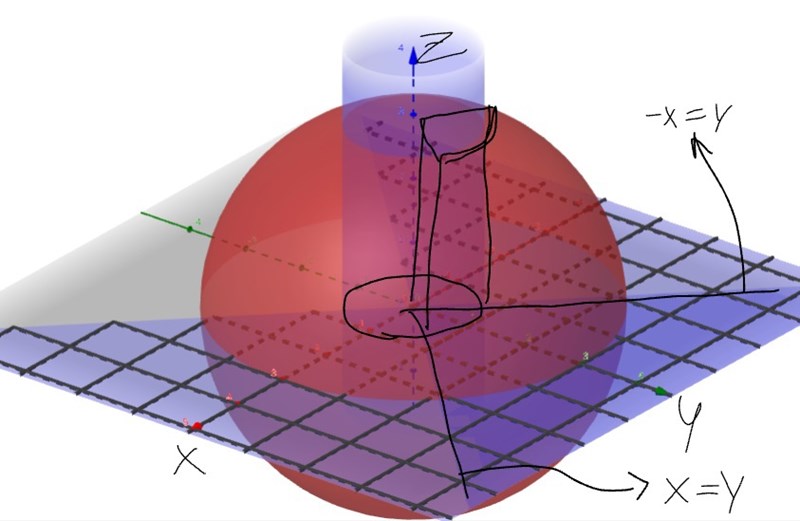 för att göra det tydligare visar jag med geogebra. Där jag har markerat går den delen av cylindern som ska bort från integralen då r ska gå mellan 1 och 3. Linjerna x=y och -x=y begränsar tillsammans det området som ska integreras.