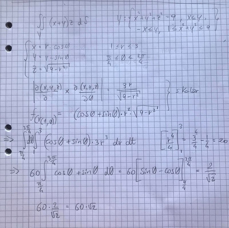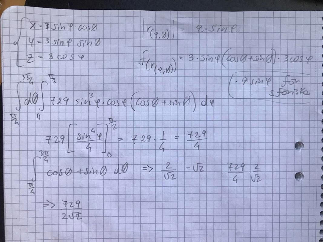 Jag är dock osäker om parametriseringen är fel eller är det jag som gör något räknefel?? Jag har kommit ihåg att lägga till r²sin(fi) vid byte av sfäriska koordinater.