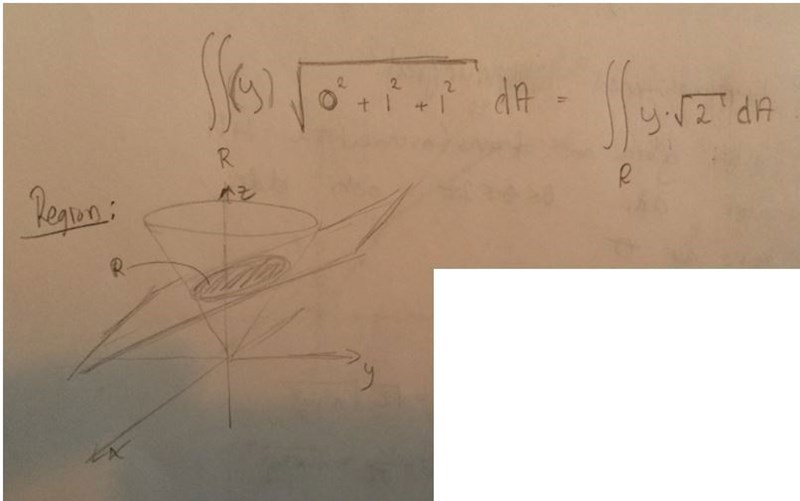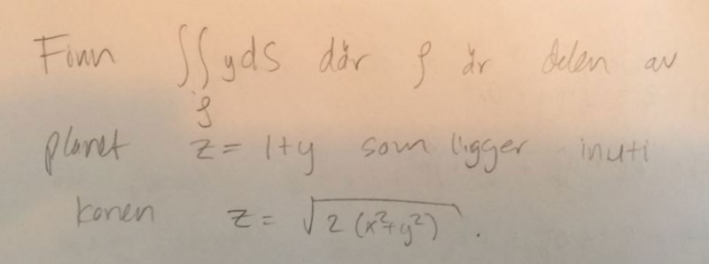 Ytintegral där ytan är en delen av ett plan som avgränsas av en kon