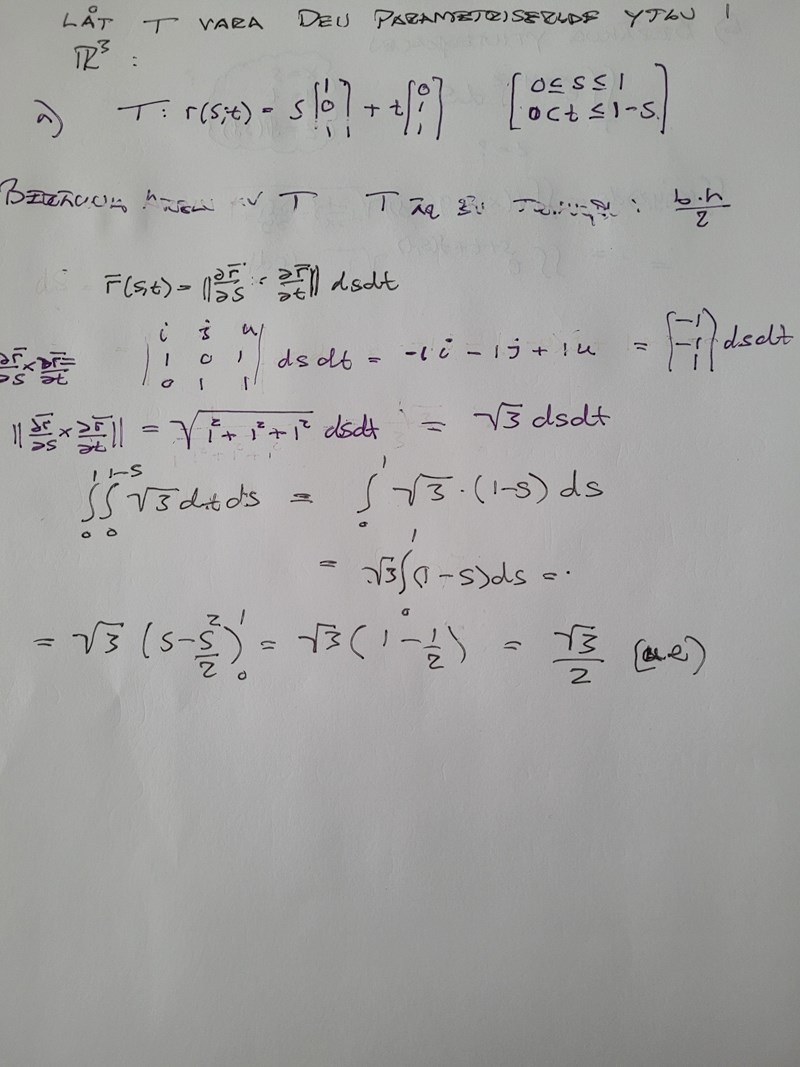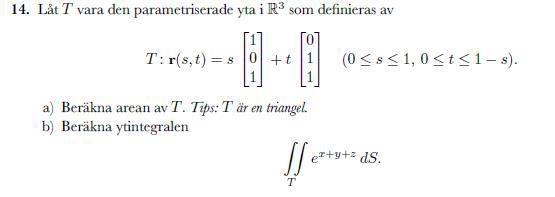 PATENTERAMERA skrev:Med parametriseringen som är given i problemet kan du uttrycka alla koordinater, x, y och z, i termer av parametrarna s och t. Så du får en dubbelintegral i s-t-planet.