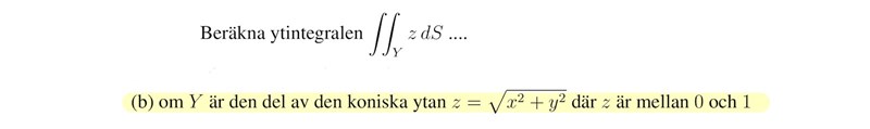 Hej, jag lyckas få fram DS = (2)^(1/2) dxdy. Men förstår inte hur jag ska tänka när jag ska få ut gränserna till x och y. Vet att figuren ser ut som en kon. Hur ska jag tänka? Enligt mig borde både x och y gå mellan -1 och 1 vilket skulle betyda att ytan är 0 vilket inte stämmer