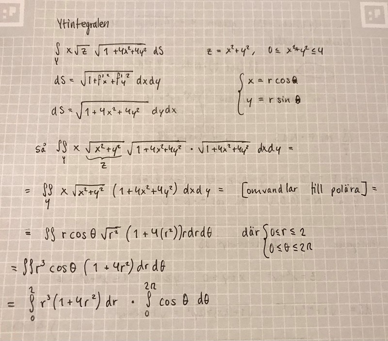 Läser också flervarre atm. Jag gjorde på ett annat sätt men fick fram exakt samma integrand så det känns ju bra. Även att , däremot tänker jag att kanske är något annat.