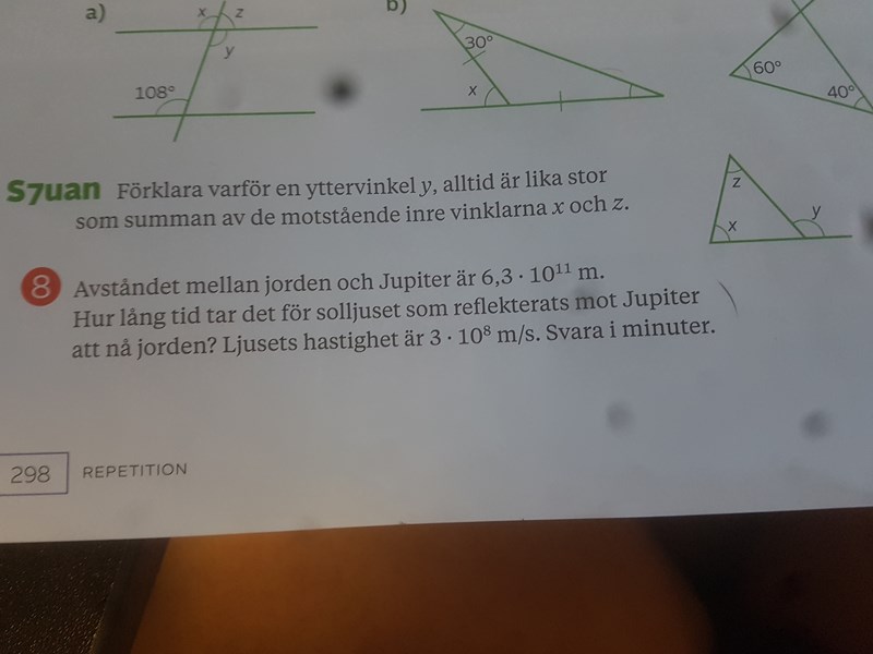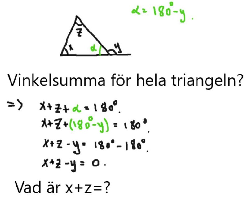 Utnyttja att vinkelsumman i en triangel alltid är 180 grader. Det gör att du kan kalla supplementvinkeln (den vinkel som tillsammans med y bildar en rät linje, alltså den enda vinkel som inte är utmärkt i bilden) för w. Då gäller sambandet x+z+w=180°x+z+w=180^{\circ}. Dessutom måste y+w=180°y+w=180^{\circ}. Kommer du vidare då? :)