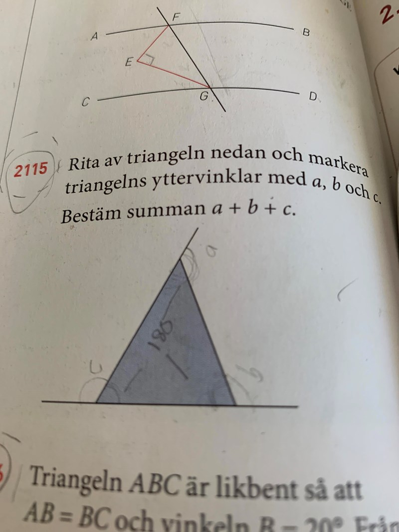 Yttervinkeln plus grannen i triangeln blir tillsammans 180°.
