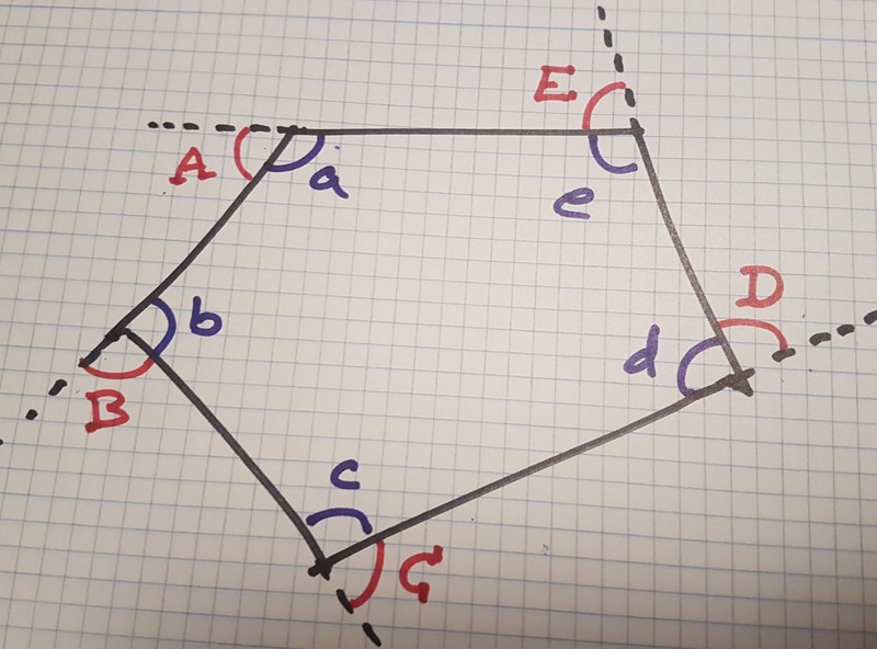 Du känner även till att summan av varje par yttervinkel/supplementvinkel är lika med 180°, dvs a+A = 180°, b+B = 180° och så vidare.