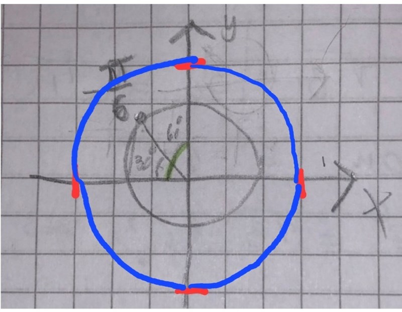 Ett bra knep att snabbt rita en grov cirkel för hand är att markera fyra punkter på koordinataxlarna (rödmarkerat i bild 1) som alla ligger lika långt från origo och sedan förbinda dem med mjukt böjda kvartscirklar (blåmarkerat i bild 2).