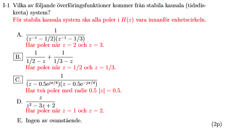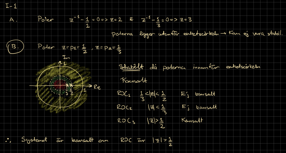 För att ett system ska vara stabilt måste polerna vara innanför enhetscirkeln (strikt innanför), och för att det ska vara kaualt måste ROC:en vara utanför den yttersta polen. Men, om vi har fler än en pol (som inte är från samma avstånd från origo) så får vi flera ROC:ar, och för en ROC kan vi ha kausalitet, och för en annan inte. För att det hela systemet då ska vara kausalt, räcker det med att en ROC är kausal, eller måste alla ROCar vara kausala?