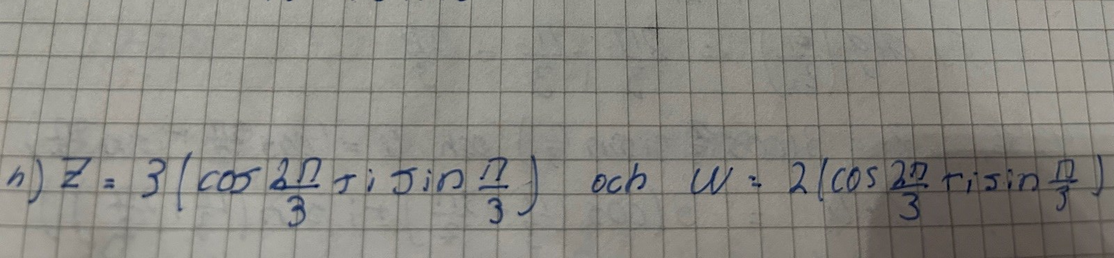 Hej, jag förstår inte denna uppgift, detta är hur jag ställt upp det, förstår inte hur arg ska skrivas dvs ska pi/3 adderas med pi/3 eller med 2pi/3