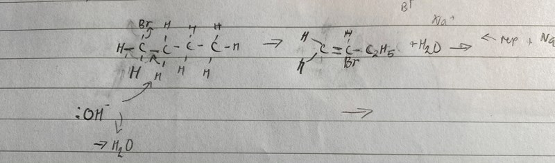 Men jag förstår då inte vart Br kommer att sitta och hur Zaitsevs regeln kommer att uppstå? för jag förstår att hydroxidjonen kommer att ta protonen från kol nr 2 och de elektronerna som blir över bildas en dubbelbinding. Br blir ju då en fri elektron och sedan borde den väl binda med någon för att kunna bilda zaitsevs regeln och Na+ borde bli balanserad?