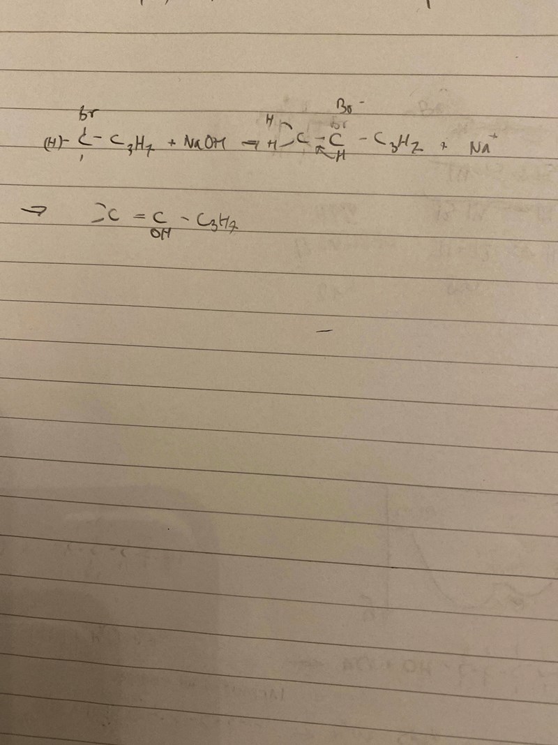 och dedär med eliminations reaktion är det istället för den andra kolen att ha H och Br så är Br- ett fritt bromidjon innan hydroxilen kör på en nukleofil attack på väteatomen och dubbelbindingen sker på andra kolen medan NaBr bildas?