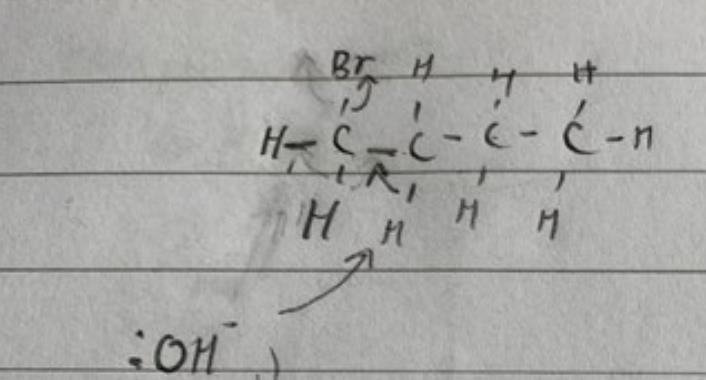 Men i ditt fall har du en primär halogenalkan (1-bromobutan), och då kommer istället en SN2 reaktion ske. Där hydroxidjonen attackerar samtidigt som bromjonen lämnar.