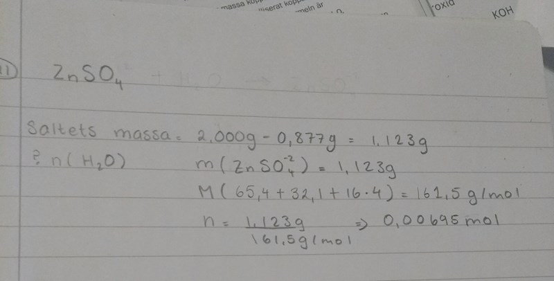 Jag förstår att man först behöver beräkna substansmängden för zinksulfat och då har jag gjort som bilden nedan. Dock så förstår jag inte hur vattnet kan försvinna överhuvudtaget när zinksulfatet är i en kristallform, då finns det väl inget vatten.