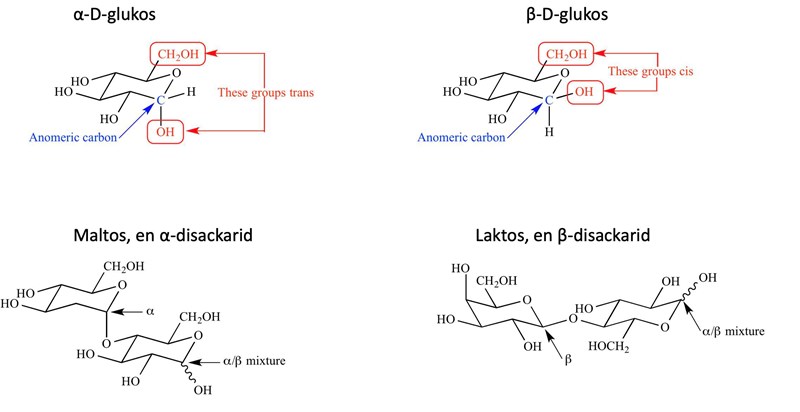 Om den resulterande glykosidbindingen blir alfa eller beta beror delvis på stereokemin hos det anomeriska kolet (anomeric carbon i bilden nedan). Är hydroxigruppen på det anomeriska kolet på motsatt sida av kolhydratringen (i trans-) mot hydroxigruppen på kol 6 har det anomeriska kolet alfa-konfiguration. Befinner sig hydroxigrupperna på samma sida av ringen (cis-) har det anomeriska kolet beta-konfigurationen.